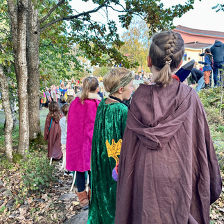 Værgudene var på vår side, og kanskje var det til og med himmelske St. Mikael som velsignet oss med sol og klarvær så vi nok en gang fikk feire en uforglemmelig Mikaeli. Fra middelaldertoget med fakler og trommer, til ridderturnering og ritt av tapre 2. klasseryttere som ble slått til riddere , til utallige motsprøver og vanndåp av årets åttendeklassinger har det vært en verdig feiring av Sankt Mikael. Tusen takk til alle kakebakende foreldre, saftinnkjøpere, motsprøvehjelpere og utkledere - vi har hatt en aldeles nydelig dag! Under ser dere et par glimt. Trykk på bildene for å gjøre dem større.
