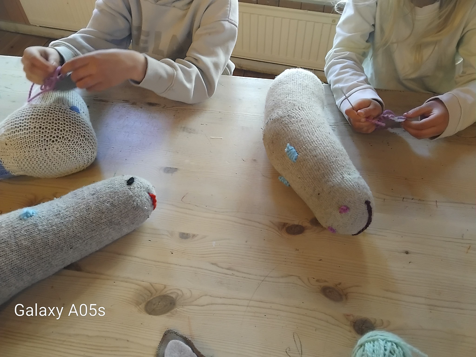 Ørene sys nå, små hender, stoppenåler med stort øye og ullgarn.